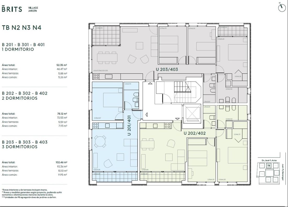 Cuenta con apartamentos de 1, 2 y 3 dormitorios.