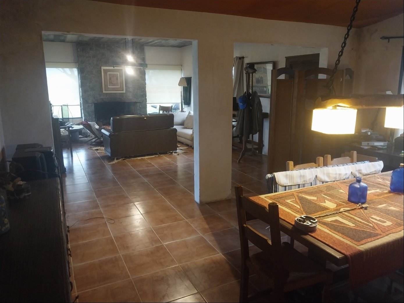 Casa principal : Living amplio con estufa de leña y vista estupenda del campo y atardecer.